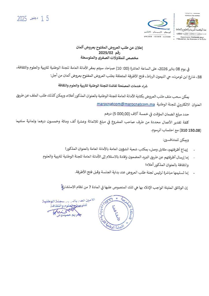 إعلان عن طلب العروض المفتوح بعروض أثمان رقم 2025/02مخصص للمقاولات الصغرى والمتوسطة